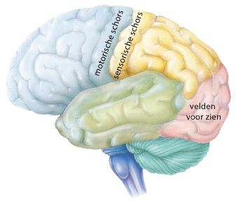 | Grote hersenen met daarin aangegeven de motorische schors, de sensorische schors en de velden voor zien. |