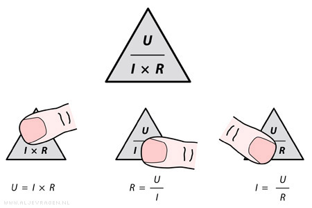 | Om berekeningen uit te voeren met de Wet van Ohm kun je gebruik maken van de bovenstaande driehoek. Bedek met je vinger de grootheid die je wilt uitrekenen. Het niet-bedekte deel van de driehoek geeft dan de formule die je moet gebruiken. |