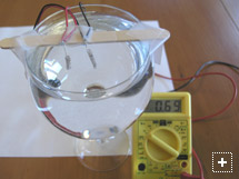 Aanvankelijk zal de voltmeter ongeveer 2 V aangeven. Omdat de gasbelletjes uiteenspatten, oplossen in water of worden opgebruikt in de reactie, gaat de voltage omlaag. Eerst snel. Later langzamer.